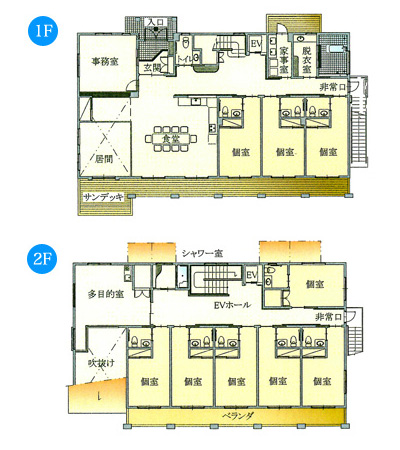 | 専用居室 | 全室個室(9室)・8帖/洗面(給湯・給水)/トイレ/収納/ エアコン/ 緊急呼出装置/ TV配線 |